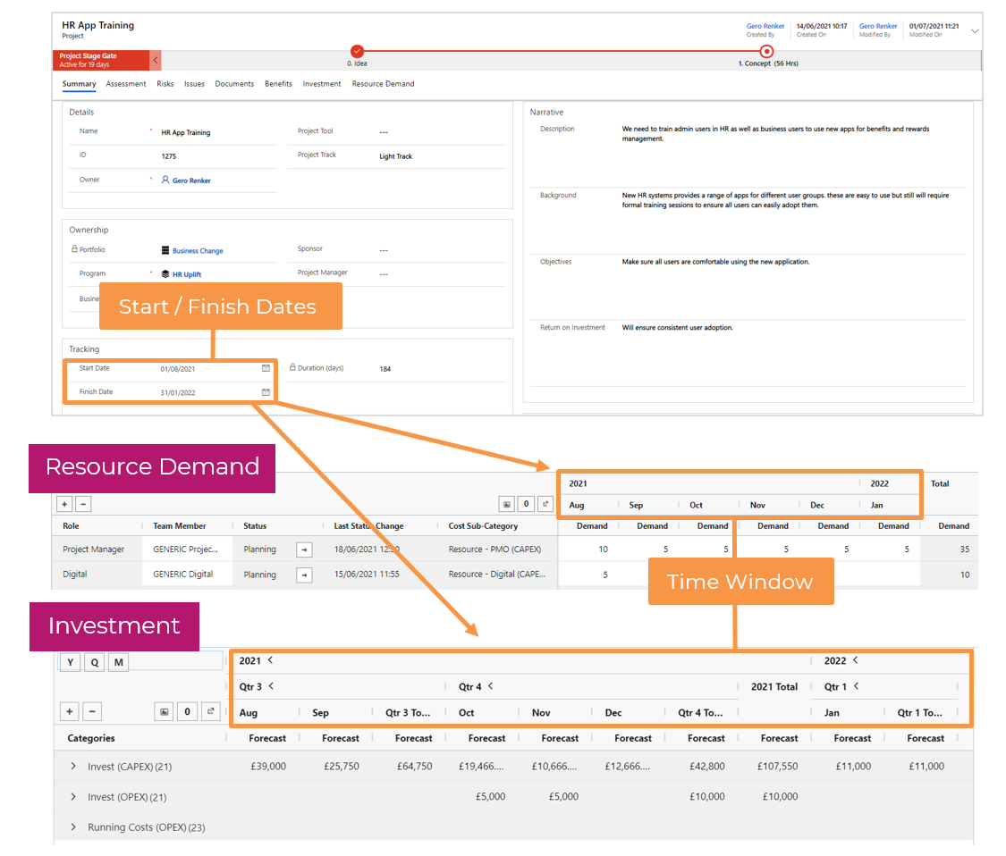 Changing the Project Start or Finish Dates in the Summary section will add or remove months from the Time Window (click Refresh before navigating to Resource Demand or Investment tab to see the update).